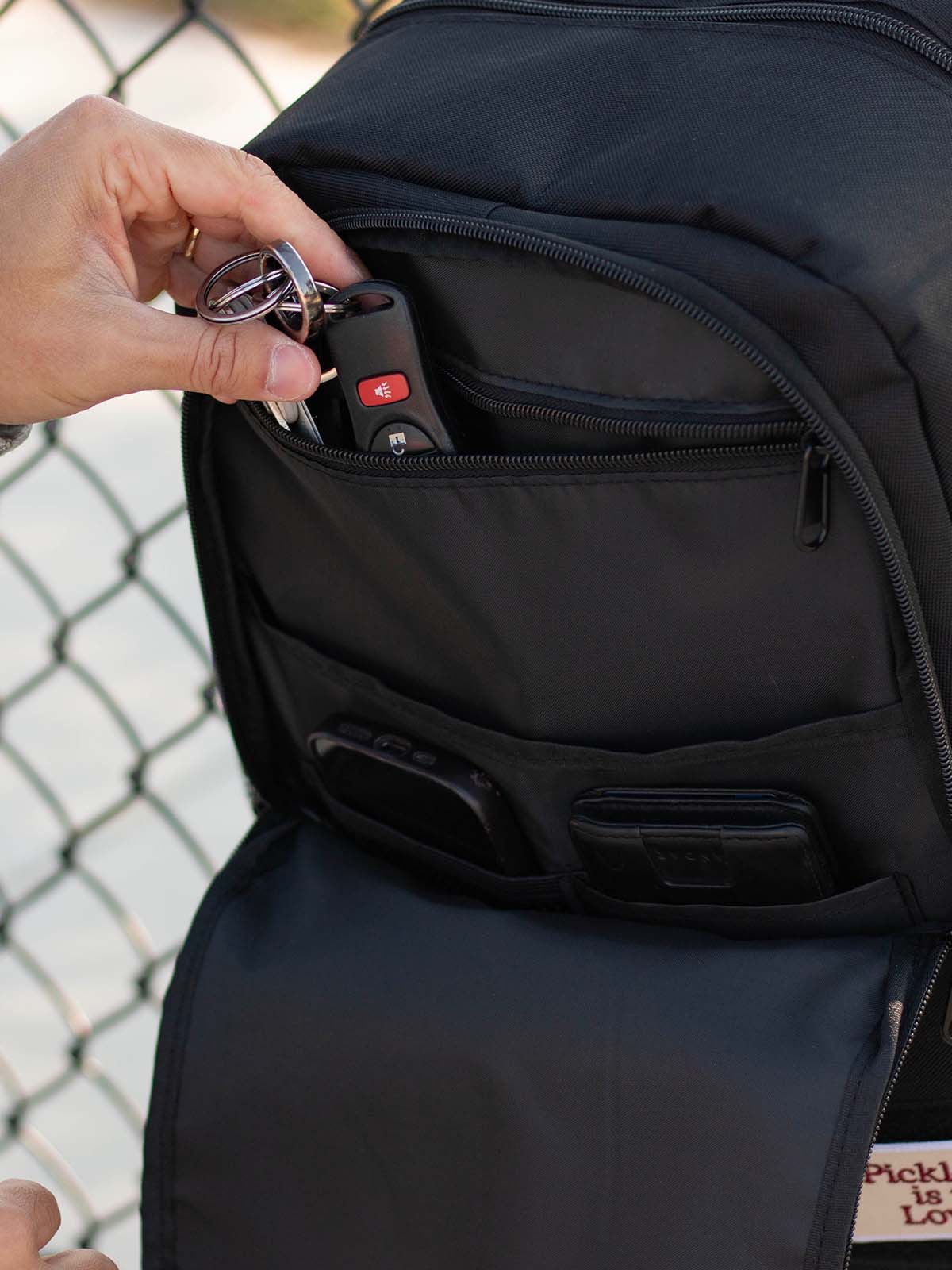 - Small zipper compartment perfect for organizing keys, wallets, phones, and more
